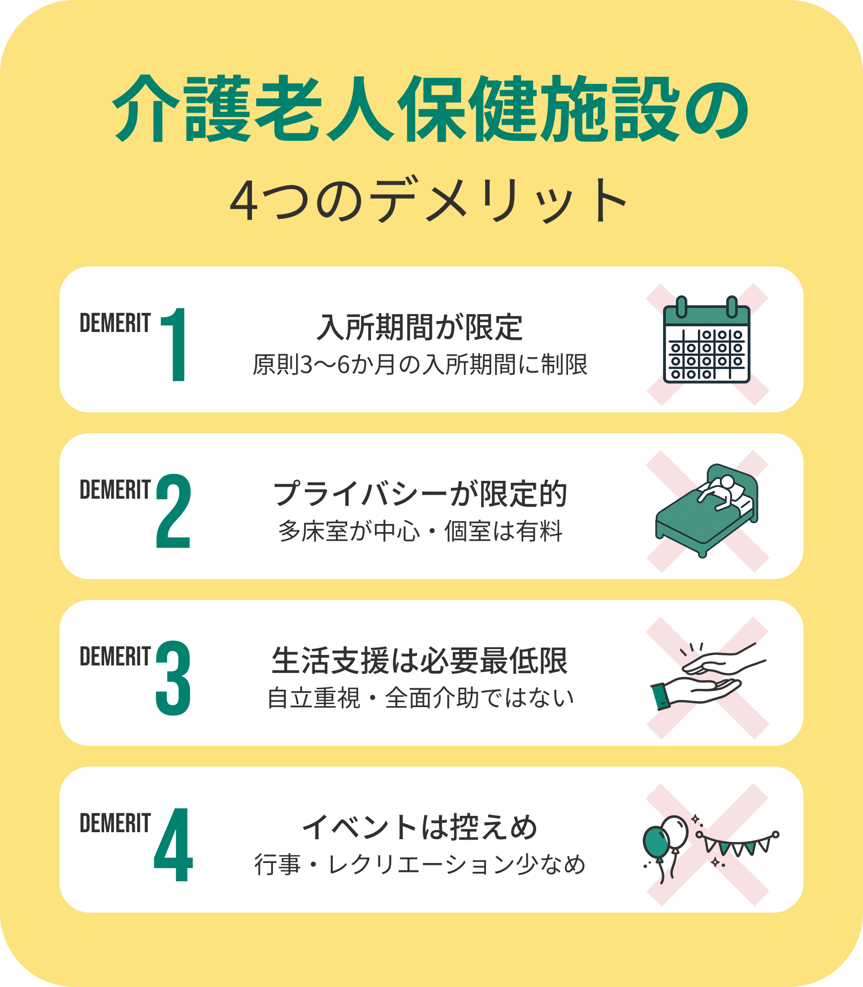老健には多くのメリットがありますが、デメリットも存在します。