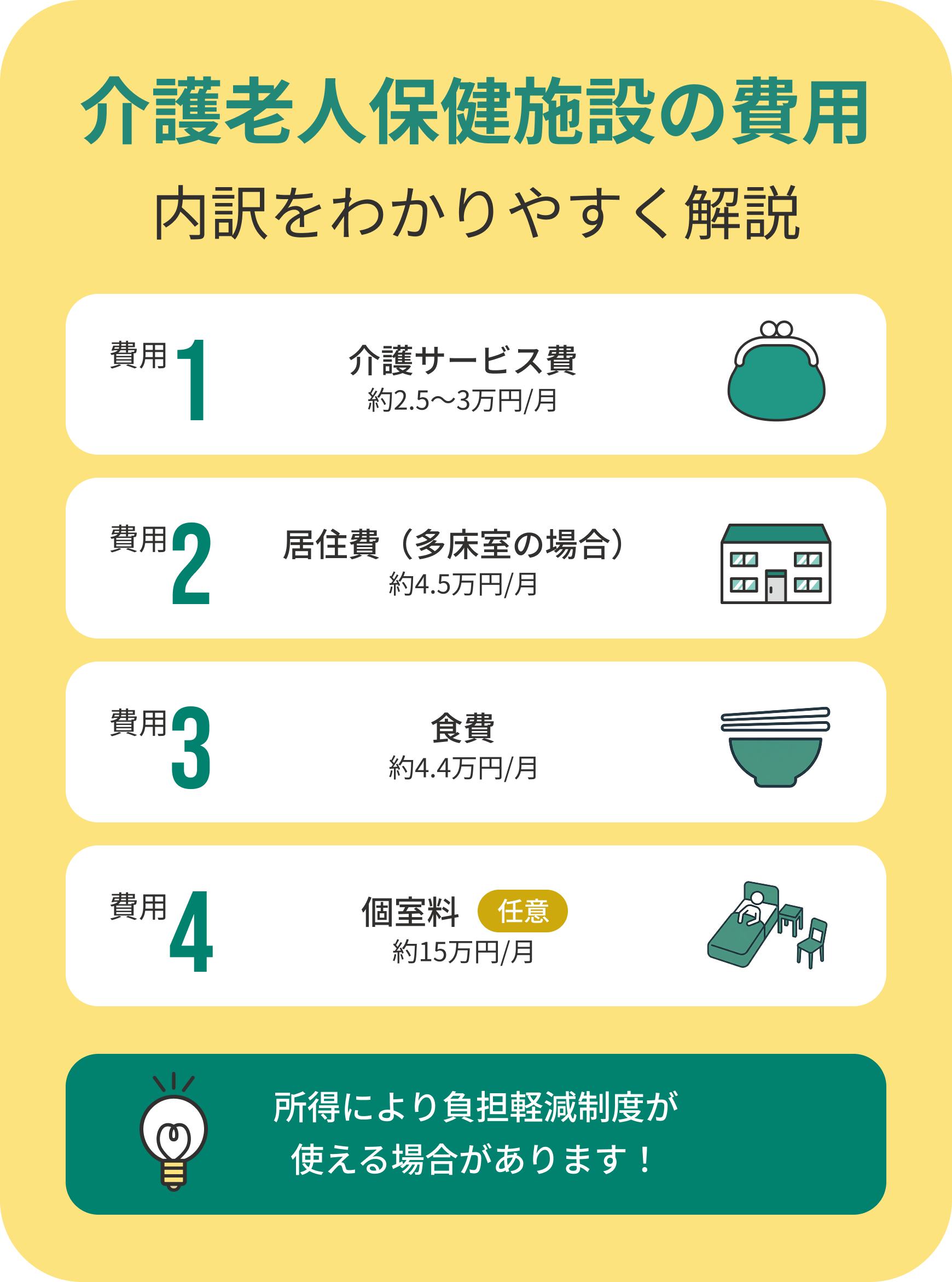 ここからは費用の内訳について詳しく紹介していきます。なお、あくまで一般的な傾向であり、施設や地域、介護度によって大きく異なります。