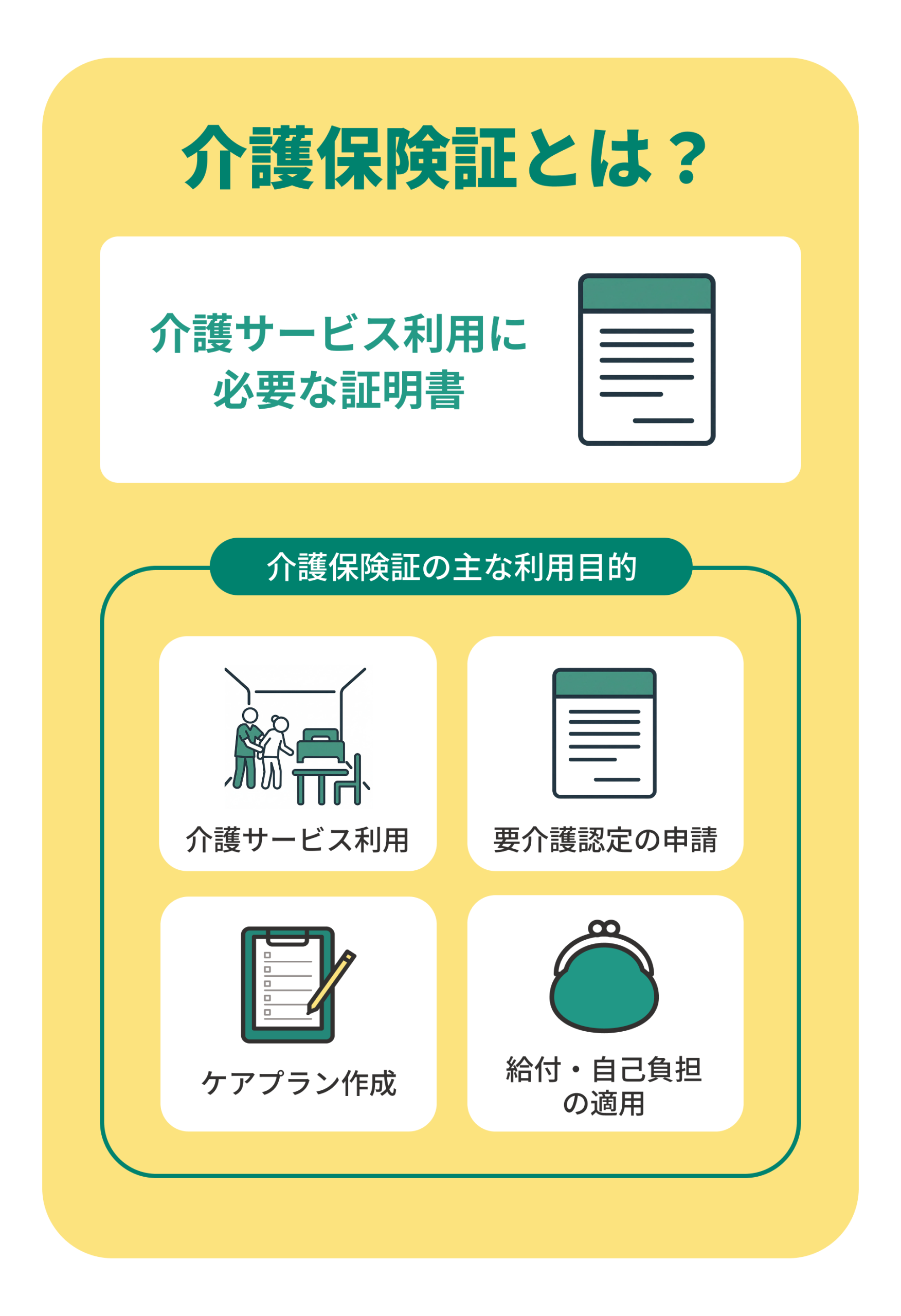 また、介護サービスを実際に利用し、費用を給付申請する際にも必ず提示が求められます。これにより、介護サービスが適正に保険適用され、利用者が正しい自己負担額でサービスを受けられる仕組みが保たれています。