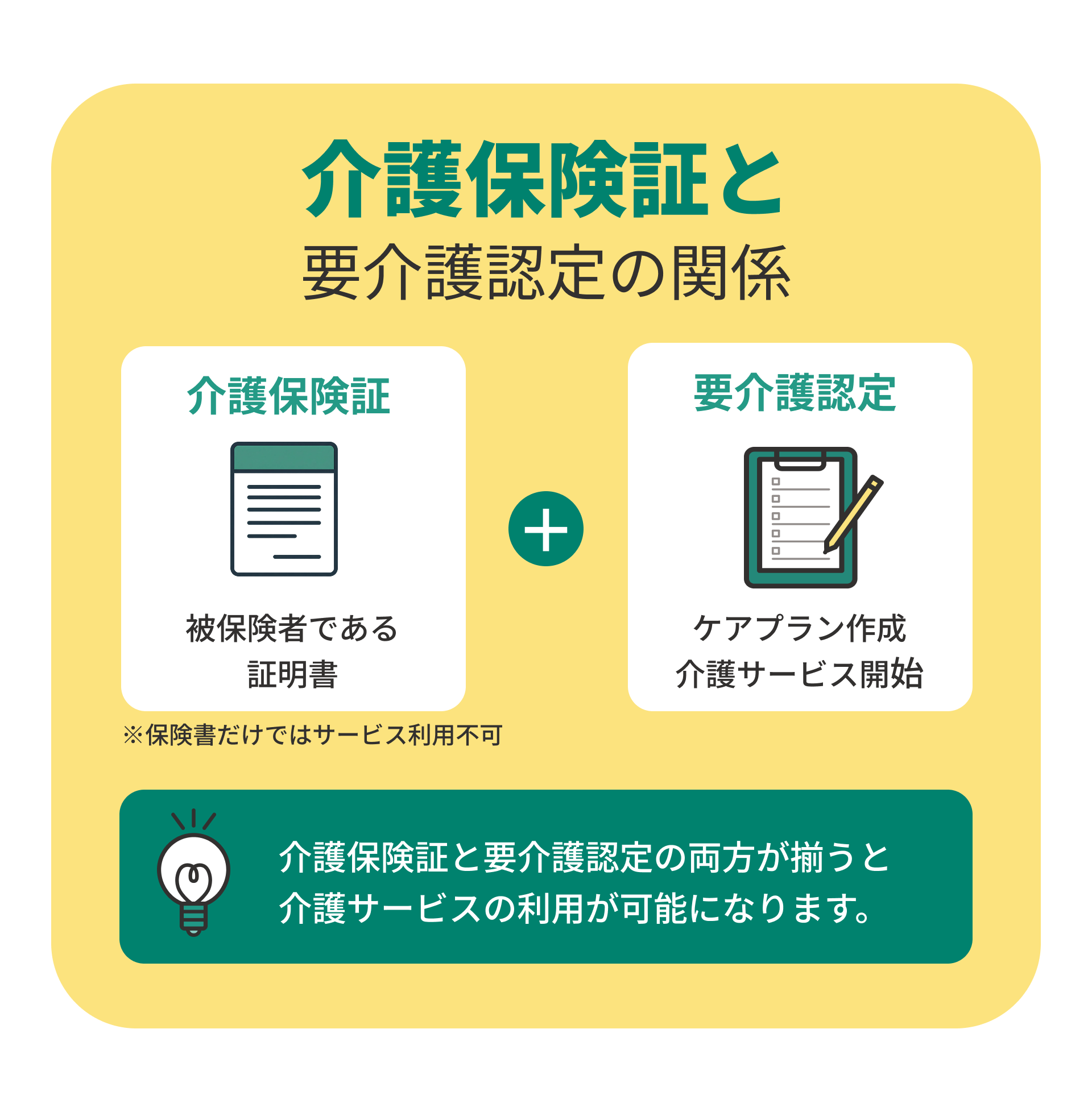 介護保険証は介護サービス利用のため、医療保険証は医療機関での診療のために必要です。役割が異なるため両方を持っておく必要があります。