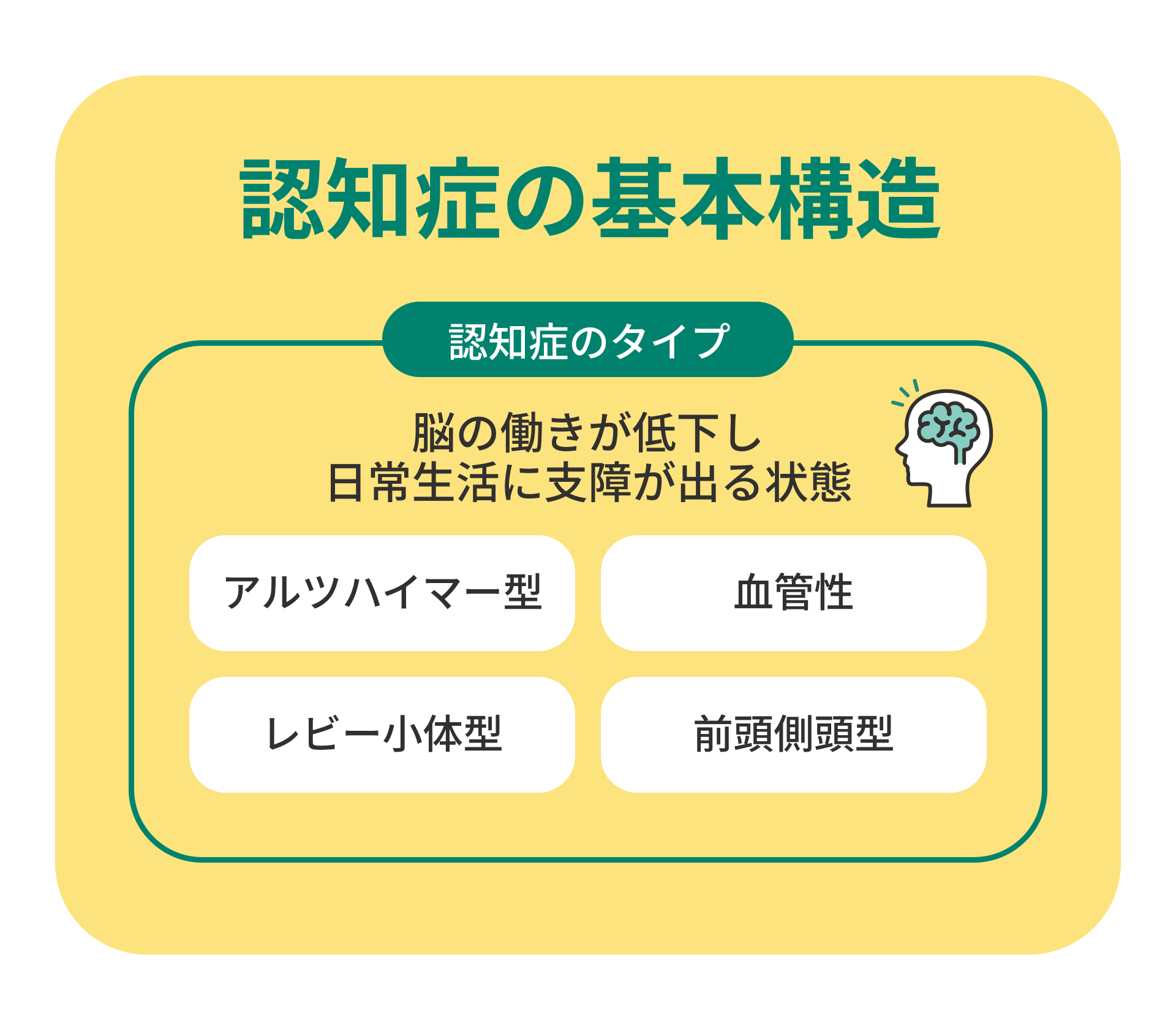 最も一般的で、初期は「最近の出来事を忘れる」といった軽い物忘れから始まります。徐々に判断力や言語能力にも影響します。