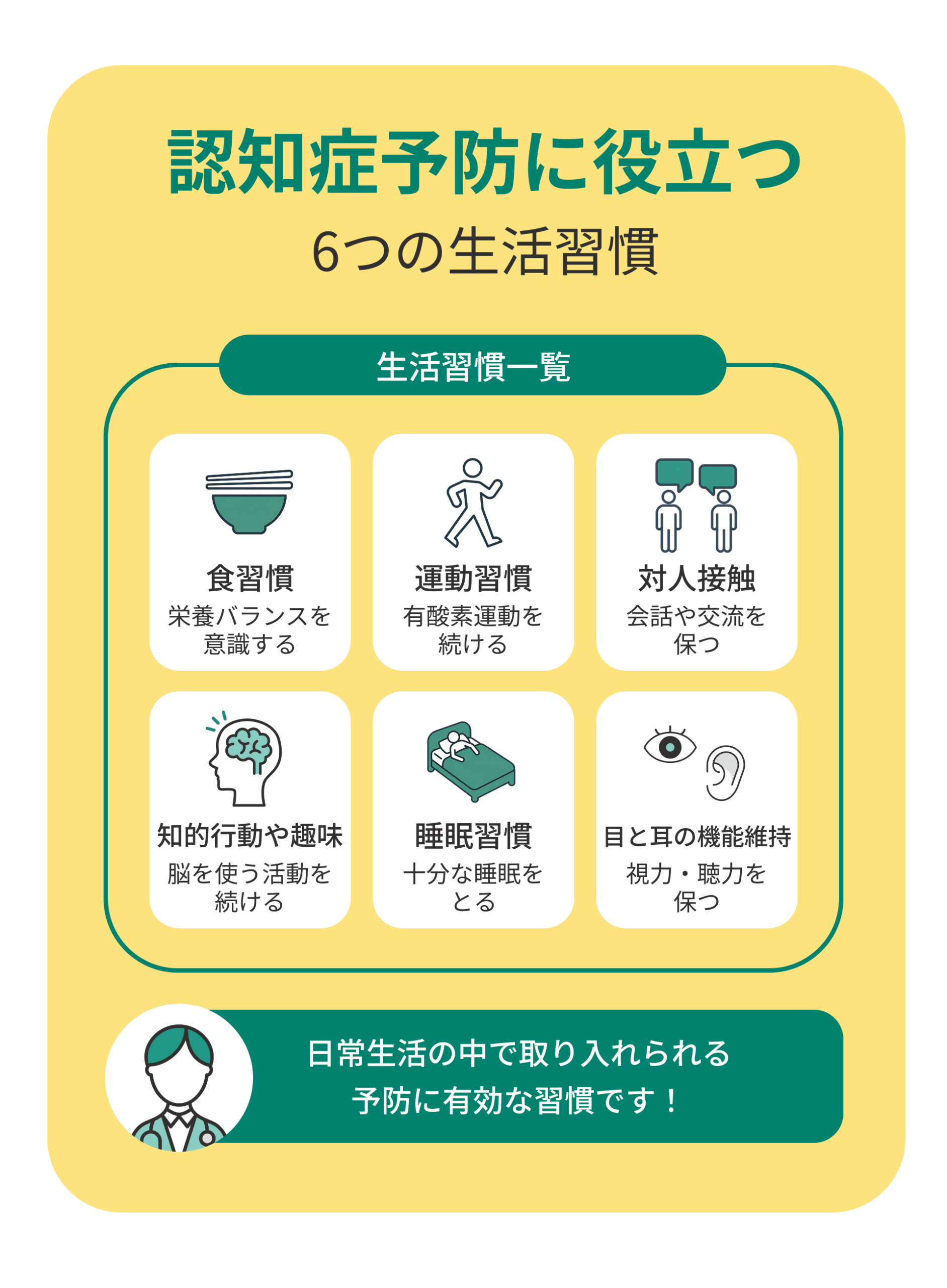 また、年代ごとの予防ポイントを意識し、違和感を覚えたときは早めに医師へ相談することが大切です。早期発見と適切な対応を心がけることで、本人も家族も安心して生活を続けることができるでしょう。