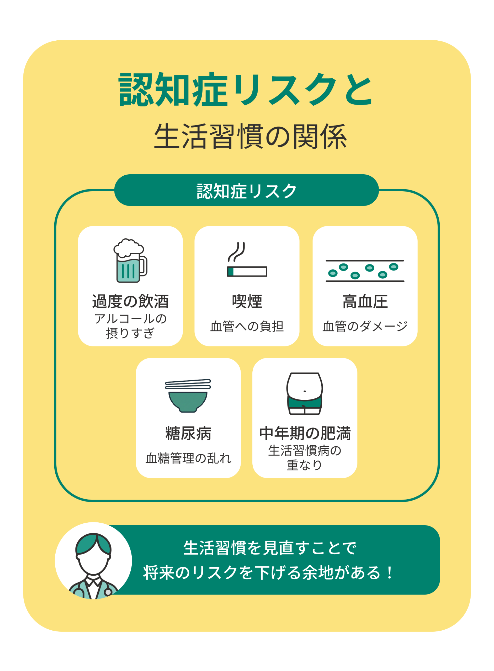 認知症は年齢だけで起こるものではなく、飲酒・喫煙・運動不足・高血圧・糖尿病などの生活習慣が密接に関わっており、中年期からケアを始めることで発症リスクを下げられる可能性があります。