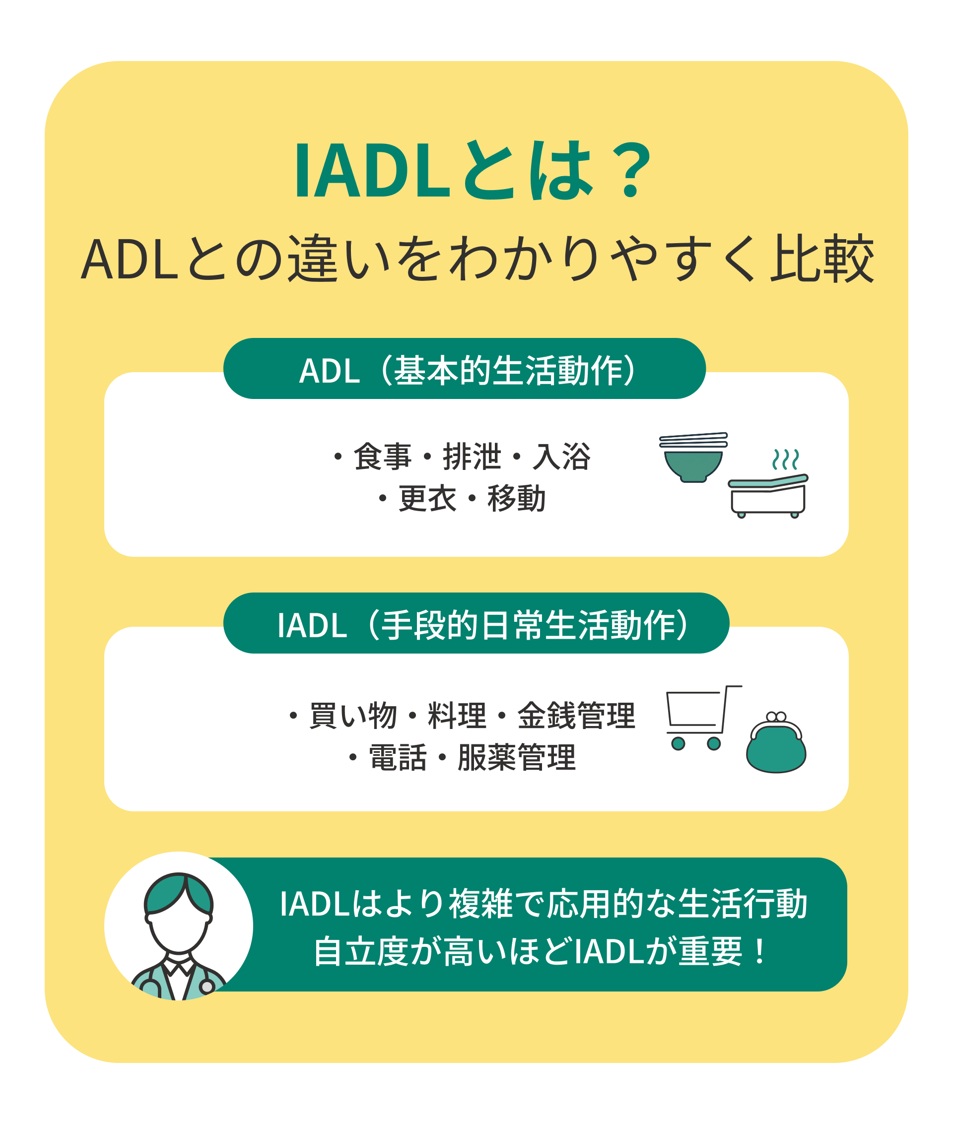 IADLを理解することは、高齢者や支援が必要な人の自立を支える第一歩といえるでしょう。