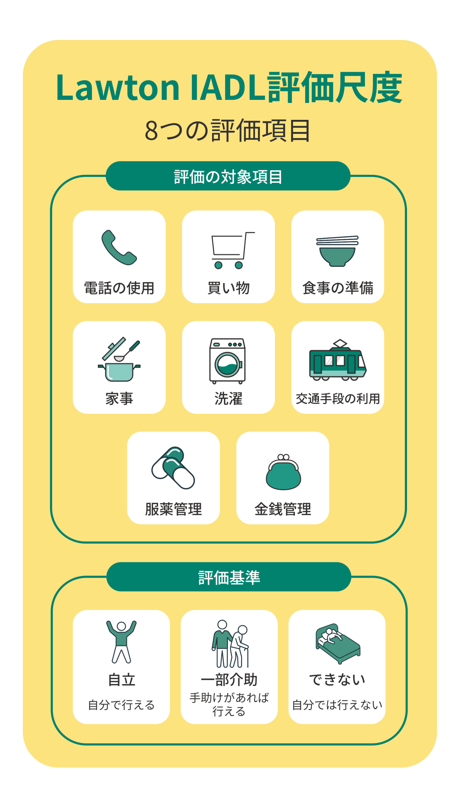 Lawton IADL評価尺度は、IADLを測定するために最も広く用いられる方法です。評価の対象となるのは8項目で、①電話の使用、②買い物、③食事の準備、④家事、⑤洗濯、⑥交通手段の利用、⑦服薬管理、⑧金銭管理です。
