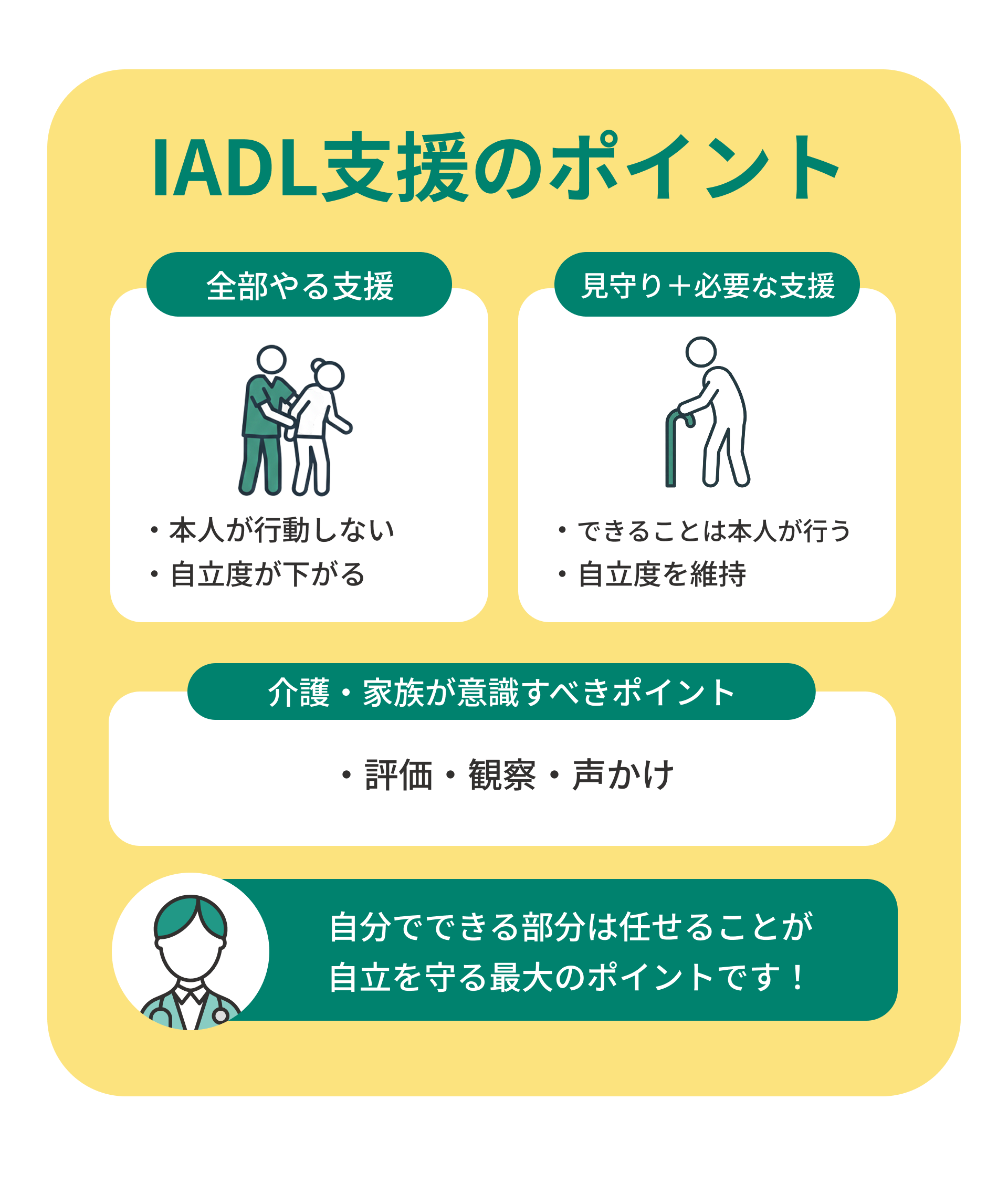 IADLを理解することは、高齢者や支援が必要な人の自立を支える第一歩といえるでしょう。