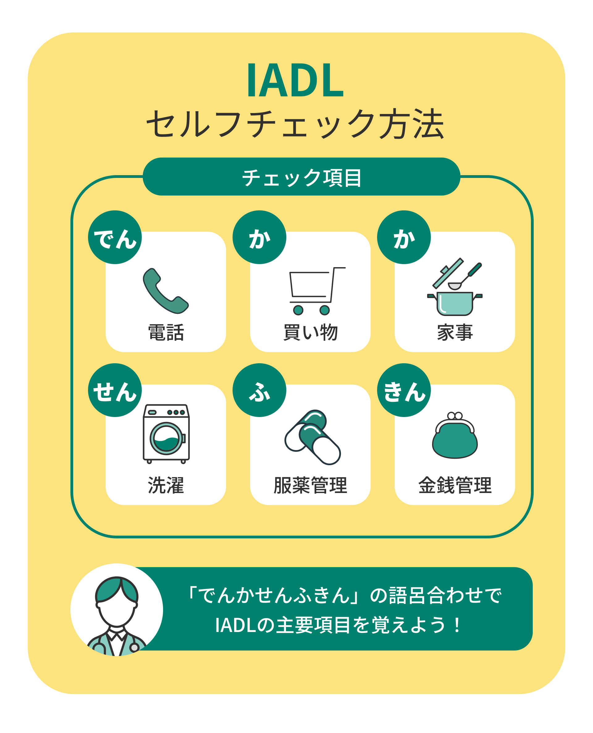 IADLの項目は数が多いため、語呂合わせで覚えると便利です。有名なのが「でんかせんふきん」です。これは「電話」「買い物」「洗濯」「服薬」「金銭管理」の頭文字をとったもので、主要なIADL項目をカバーしています。