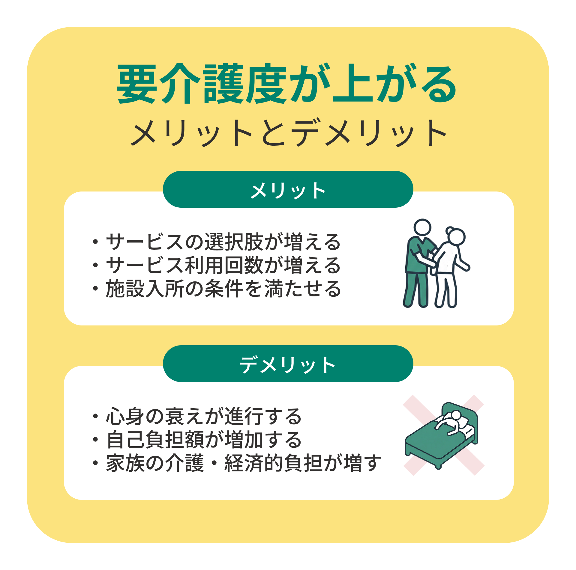 一方で、心身の状態が悪化していることを意味するため、生活の自由度が下がったり、費用や家族の負担が増えたりする可能性もあります。