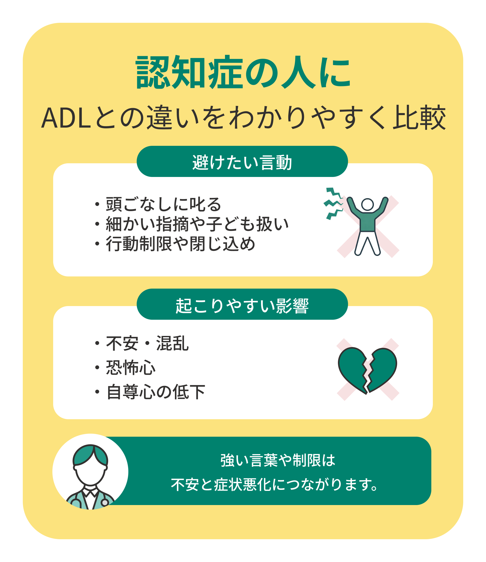 突然叱られると、本人は混乱し、「自分は悪いことをしたのだろうか」と強い不安を感じ、その結果、萎縮して言葉数が減ったり、記憶の混乱が進んだりすることもあります。