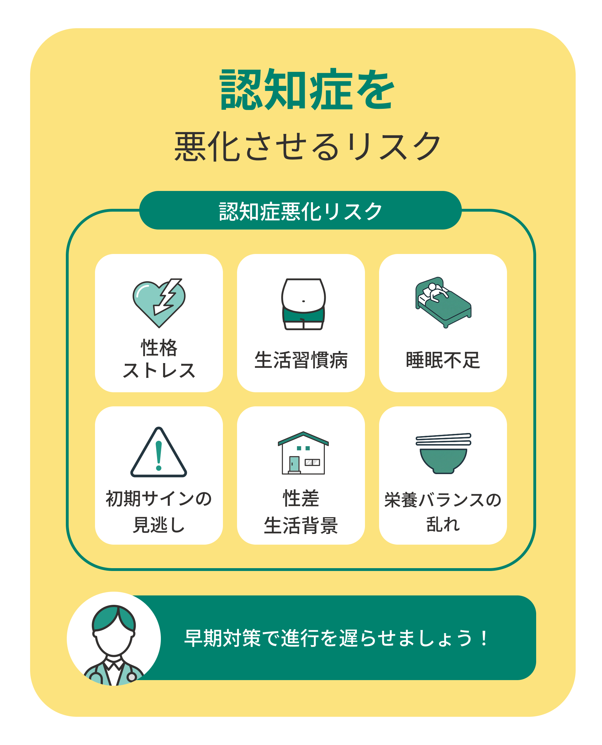 認知症は、進行を完全に止めることは難しいですが、悪化を遅らせることはできます。そのためには、リスク要因を理解し、早めに対策をとることが大切です。