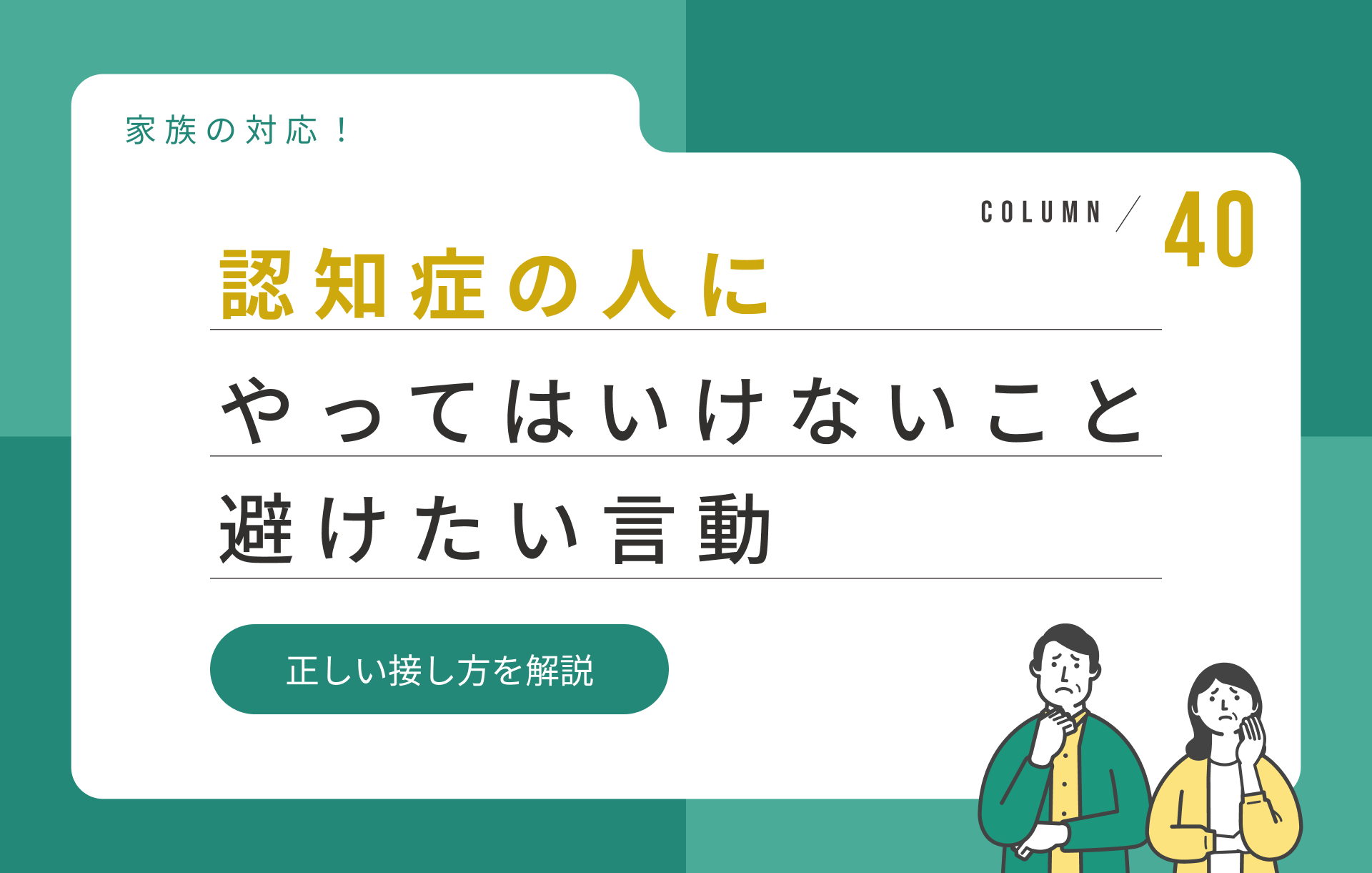 認知症の人に接するとき、知らず知らずのうちに「やってはいけないこと」をしてしまうことがあります。頭ごなしに叱ったり、子ども扱いをしたりすると、相手を傷つけたり不安にさせたりする原因になりかねません。