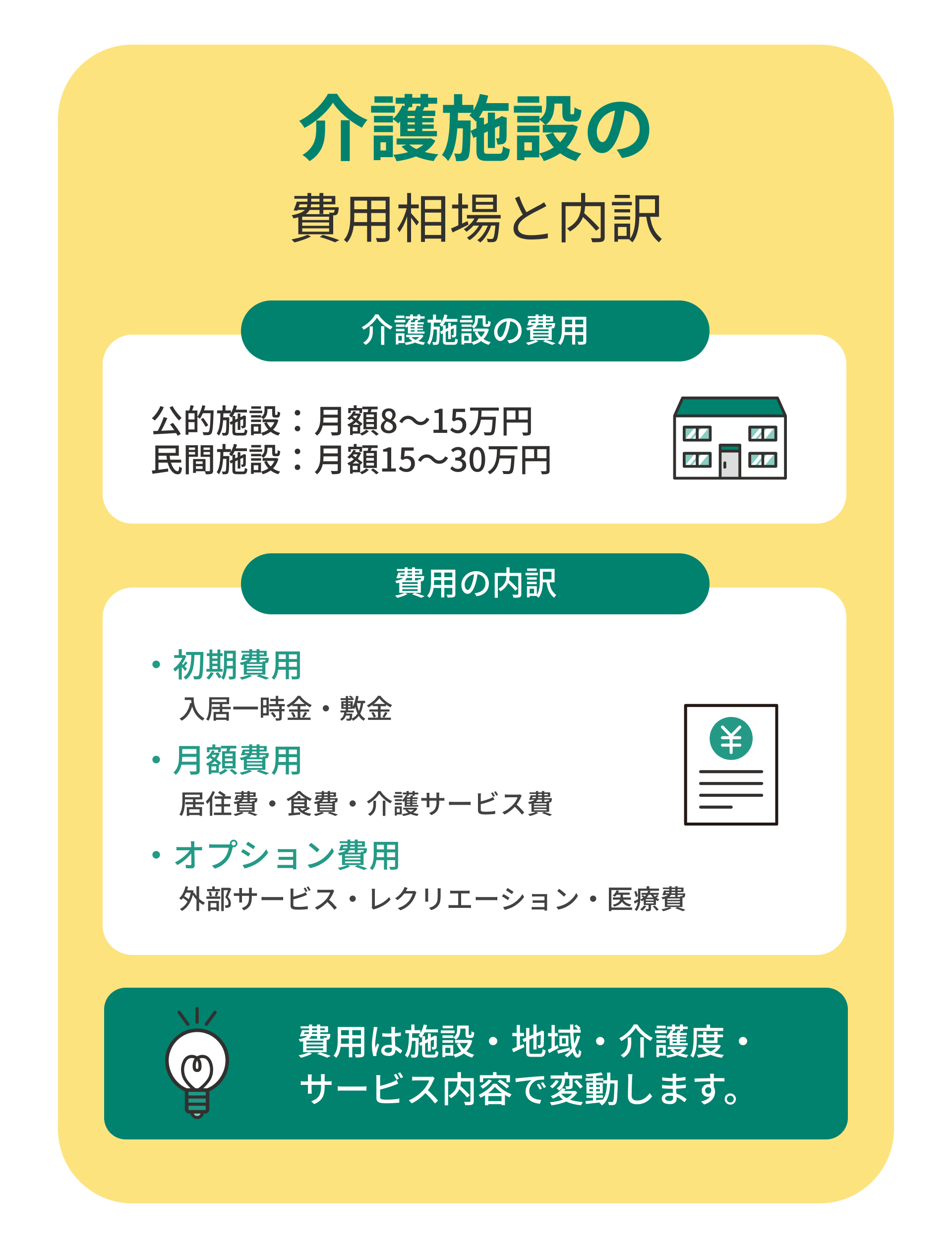 月額費用は、居住費・食費・介護サービス費を合わせた基本の支出で、生活するうえで必ず発生します。これに外部サービス利用費やレクリエーション費などのオプション費用が加わり、最終的な支出が決定。