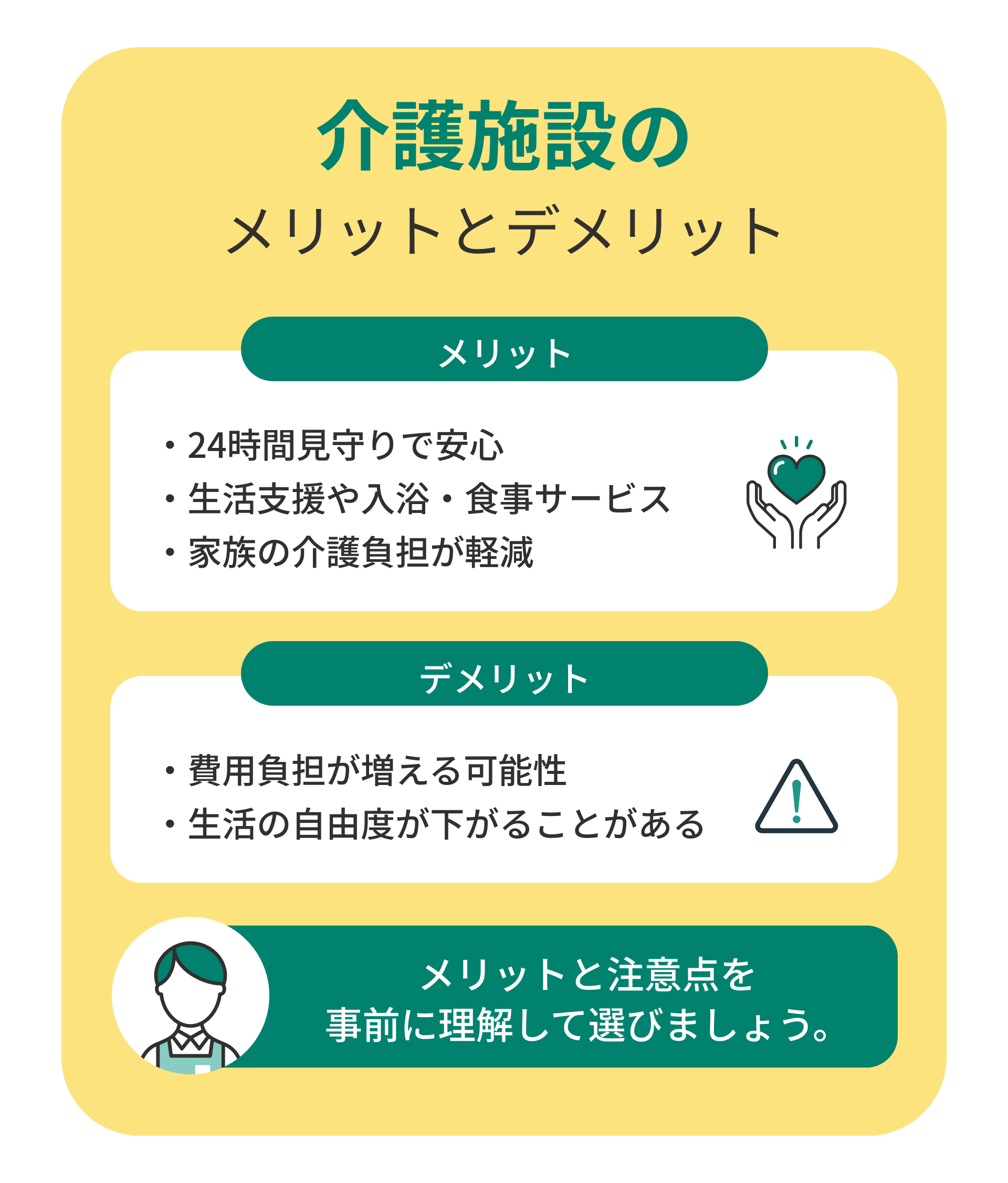 入居前にメリットとデメリットの両方を理解しておくことで、後悔の少ない施設選びができます。