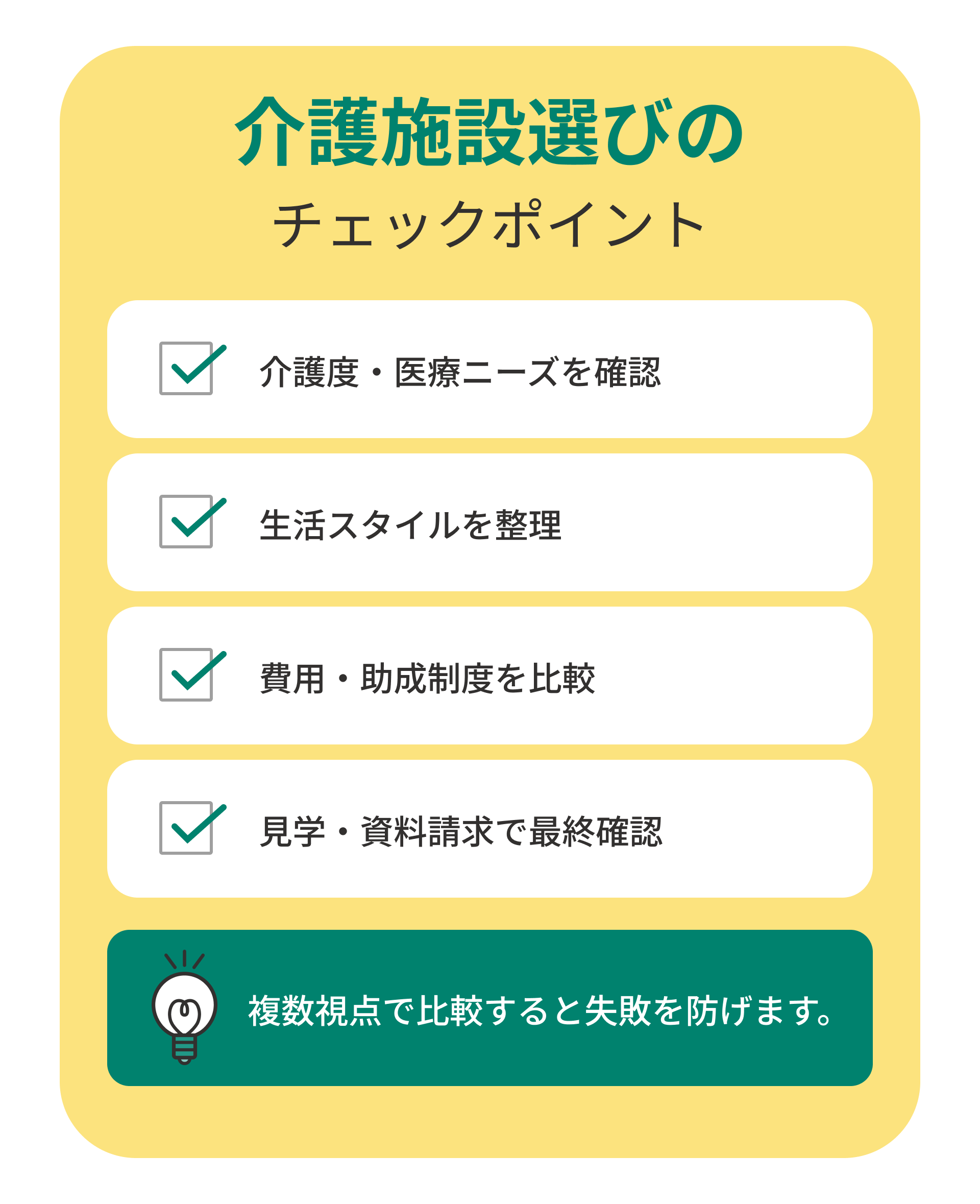 特徴を理解し、複数の施設を丁寧に比較しながら、自分や家族が安心して暮らせる場所を選んでください。